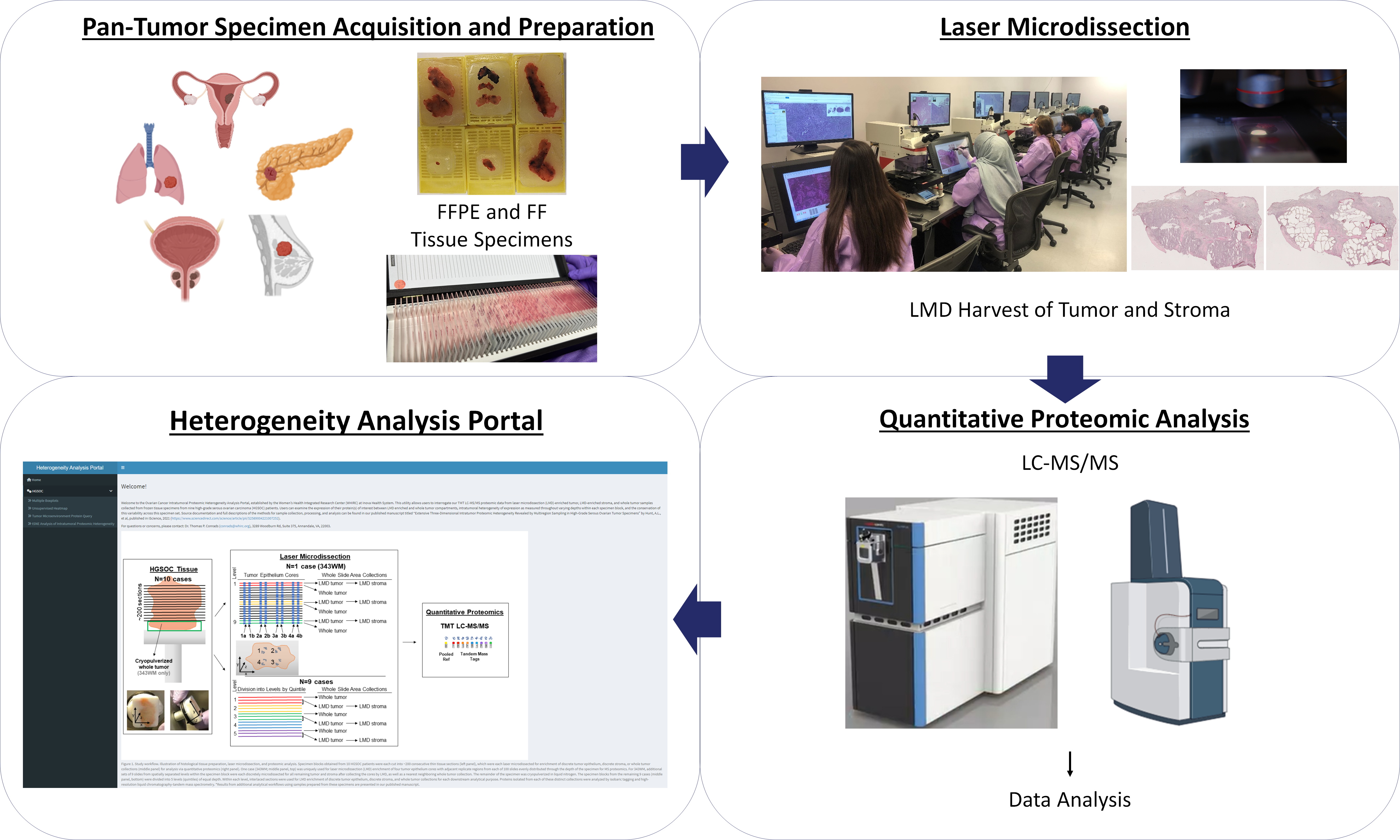 The Intratumoral Proteomic Heterogeneity Analysis Portal, established by the Women’s Health Integrated Research Center (WHIRC) at Inova Health System, allows users to interrogate our quantitative mass spectrometry-based proteomic analyses of LMD-enriched tumor, LMD-enriched stroma, and bulk/whole tumor samples harvested from cancer tissue specimens from various organ site malignancies.